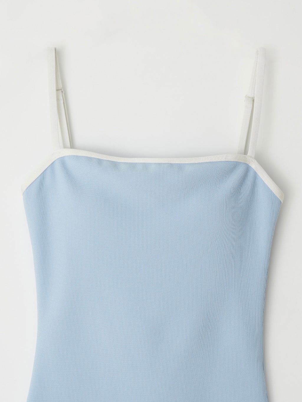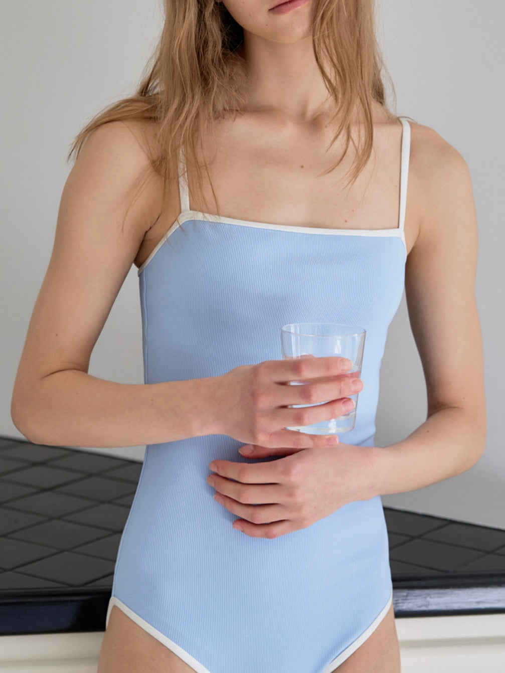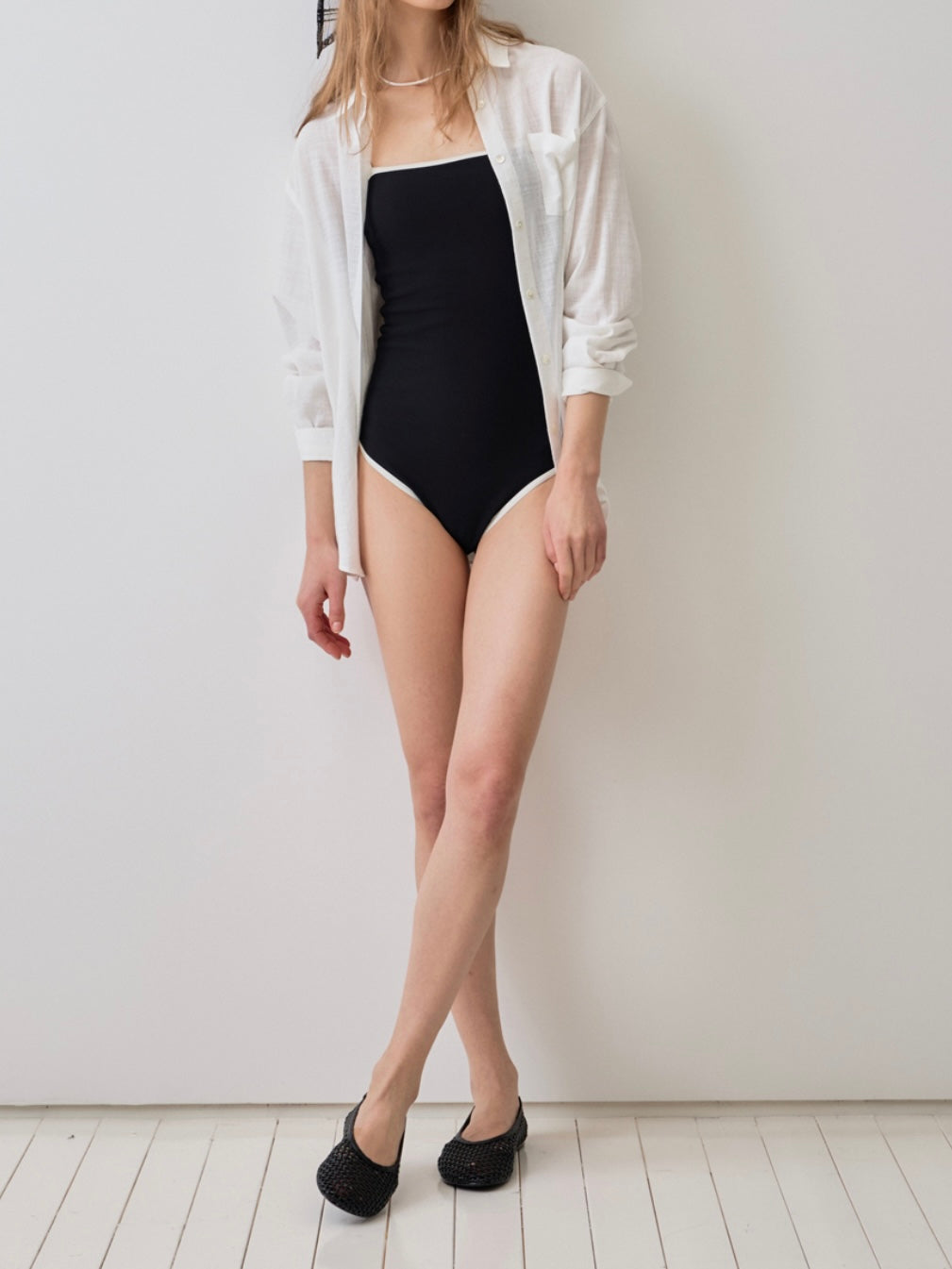 - Sleek one-piece swimsuit with a minimalist straight neckline