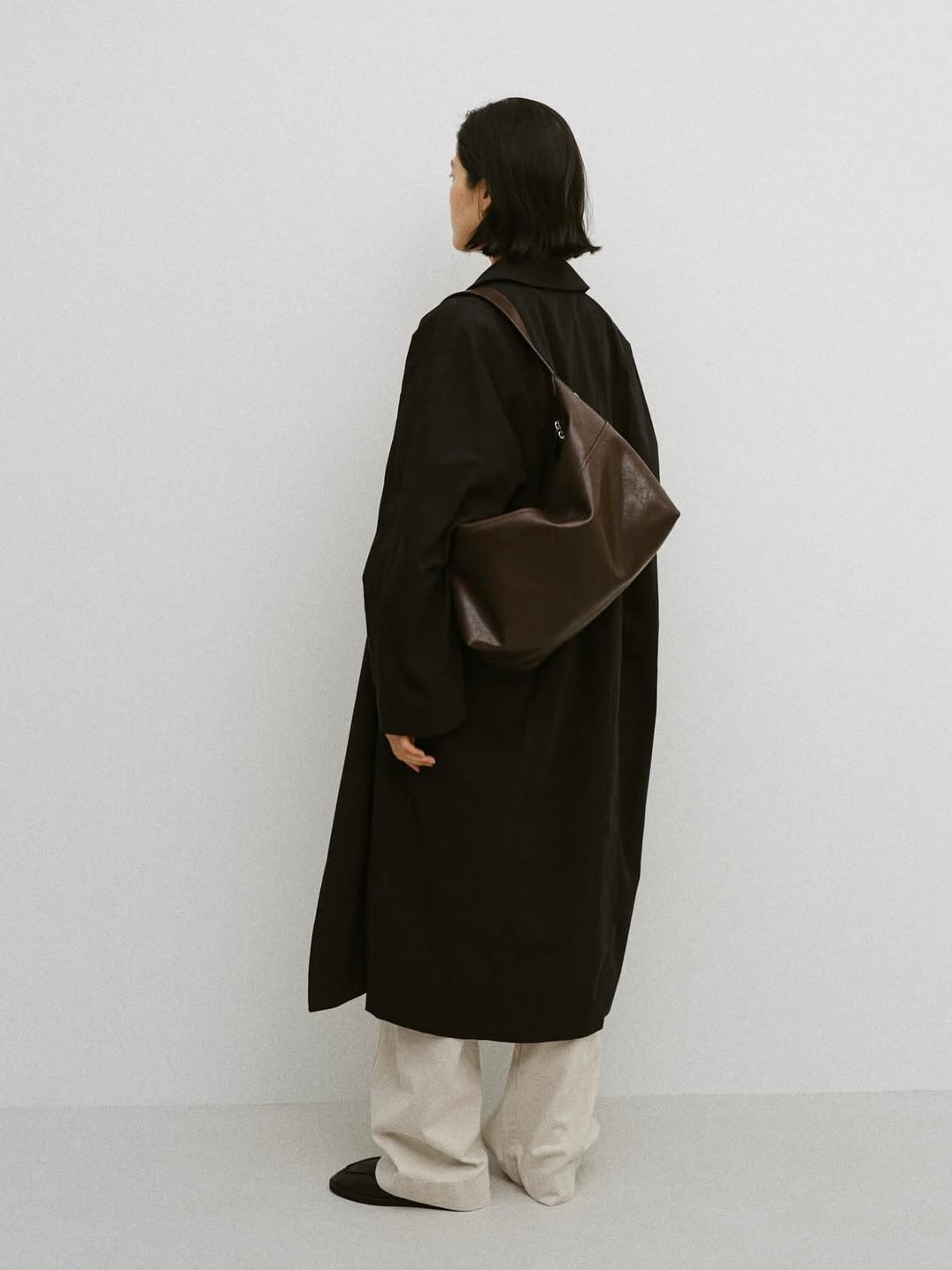 • Minimal single-breasted long coat with a clean silhouette