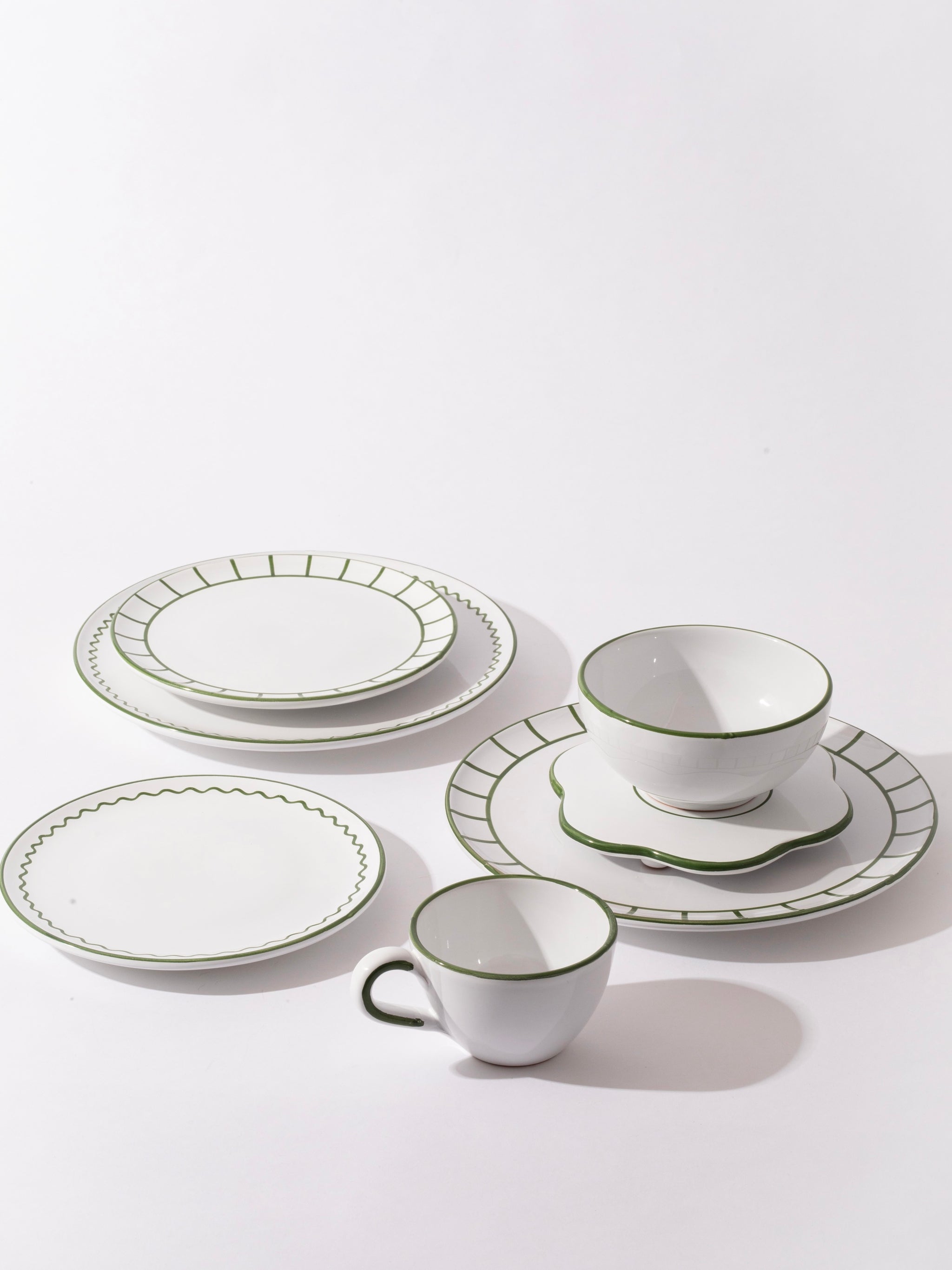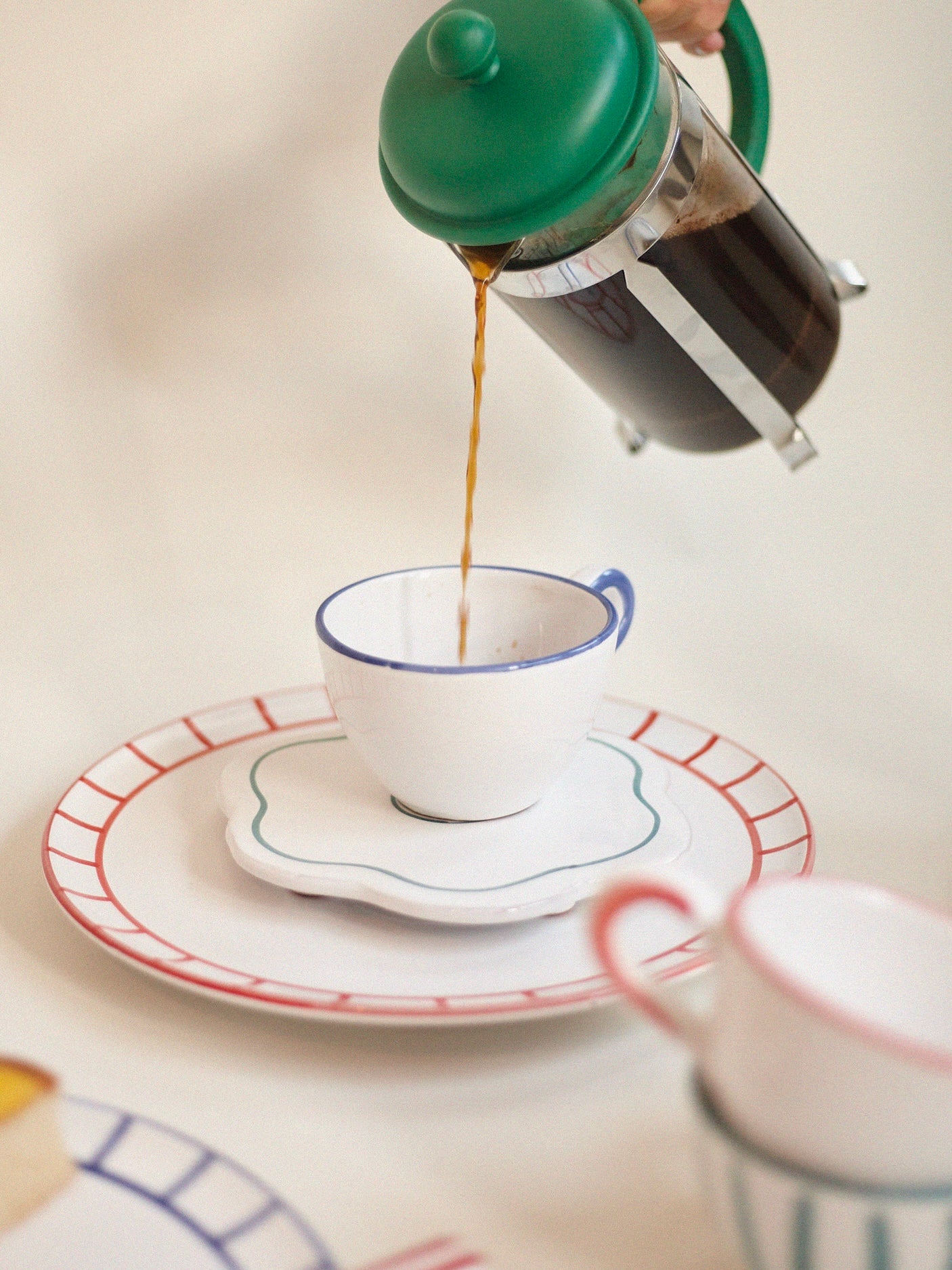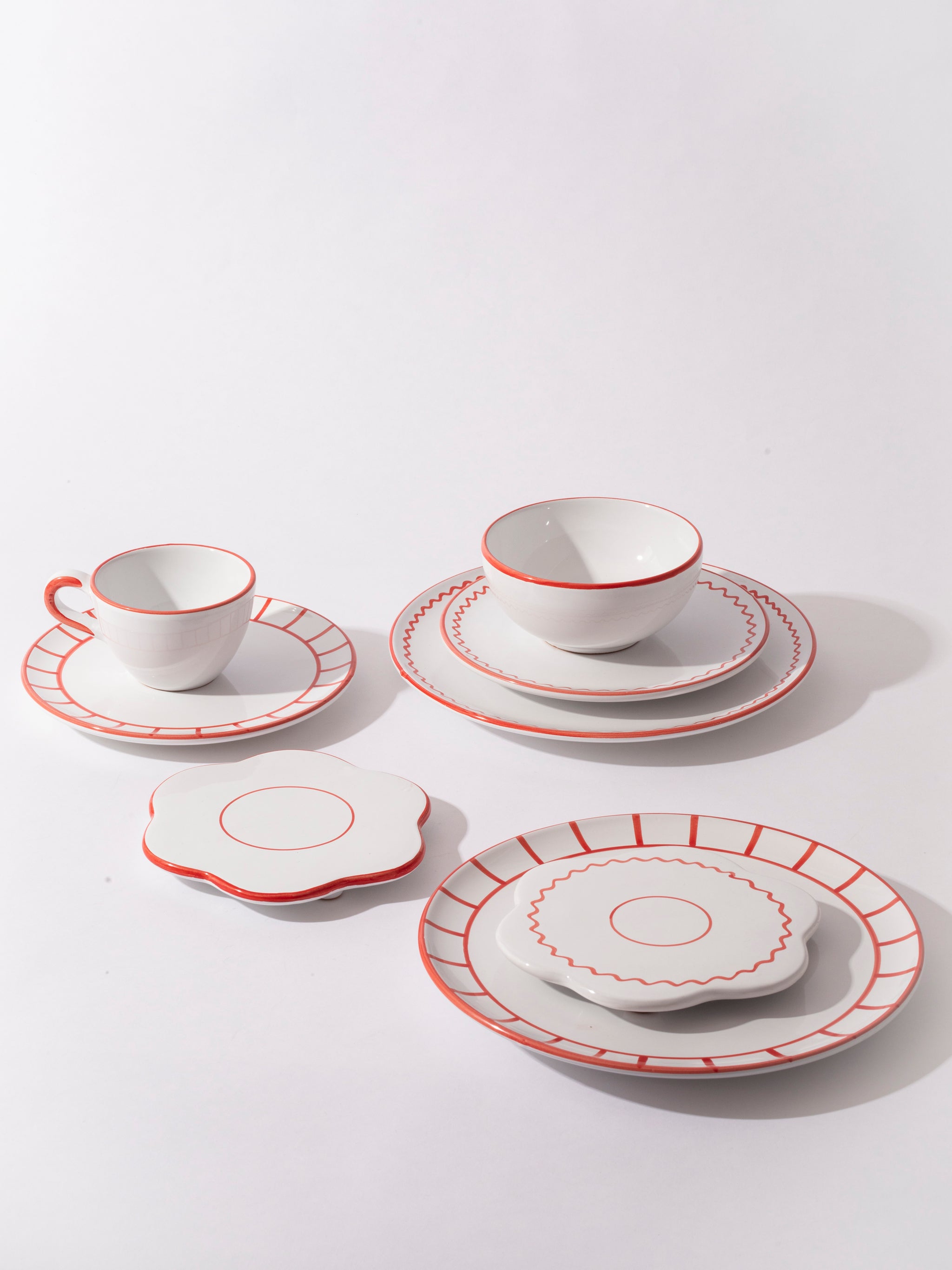 The bistro ceramic collection is inspired by traditional bistro porcelaine, but with a twist. The colours is inspired by the classic french bistro with a lobster red and basil green, and a more classic blue that match with everything in your kitchen cabin. The collection of italian hand-painted ceramics consist of saucers, bowls, bottles, lunch plates and dinner plates. When mixing and matching prints and colors it makes an infinite different combinations for the everyday tablescape.