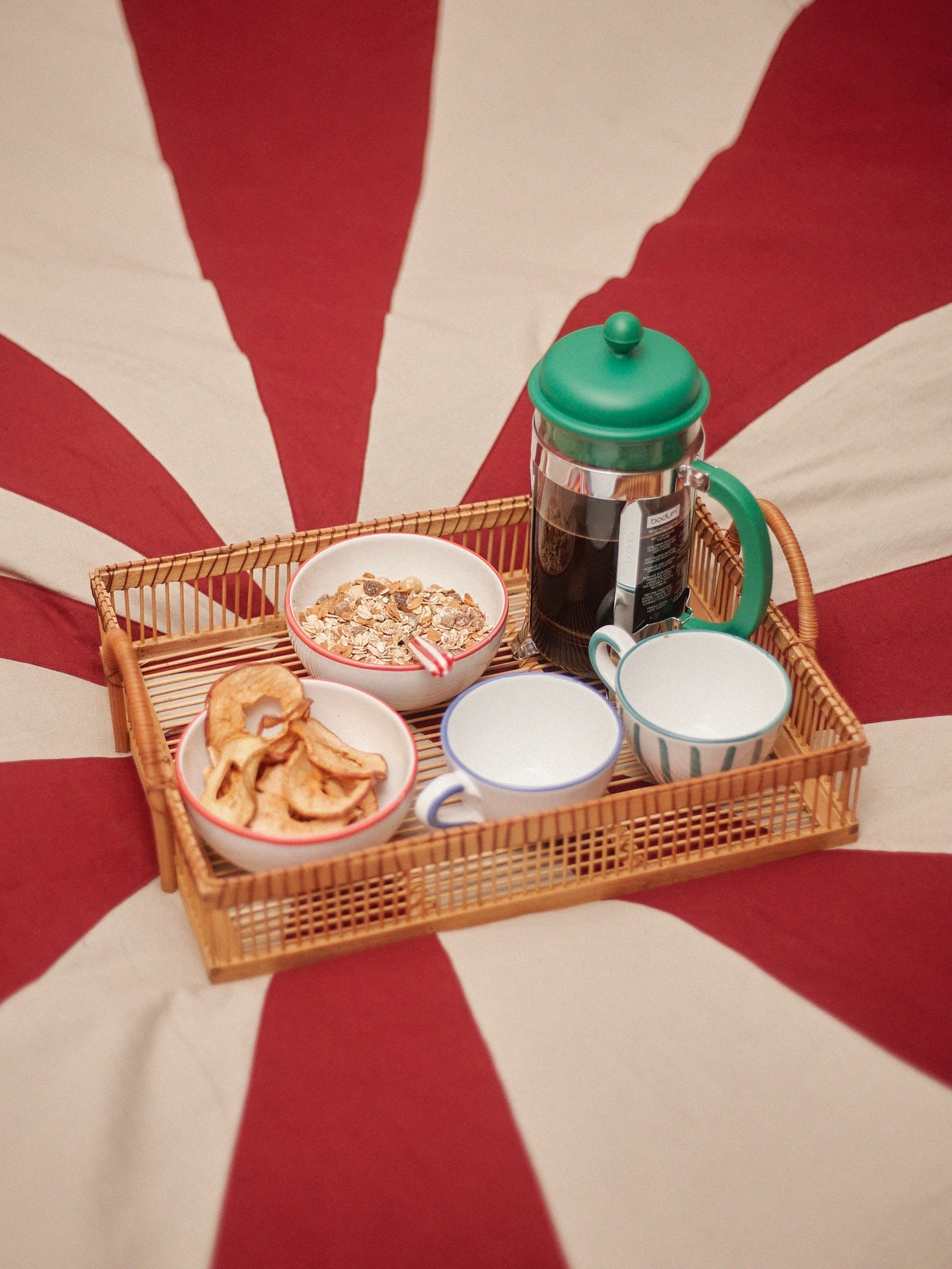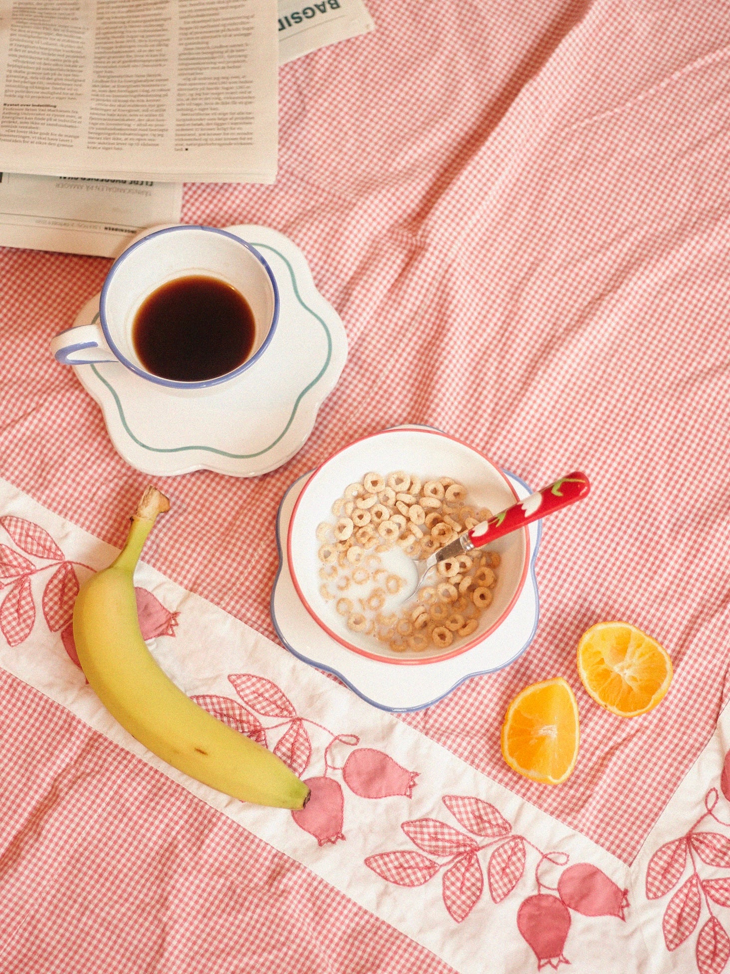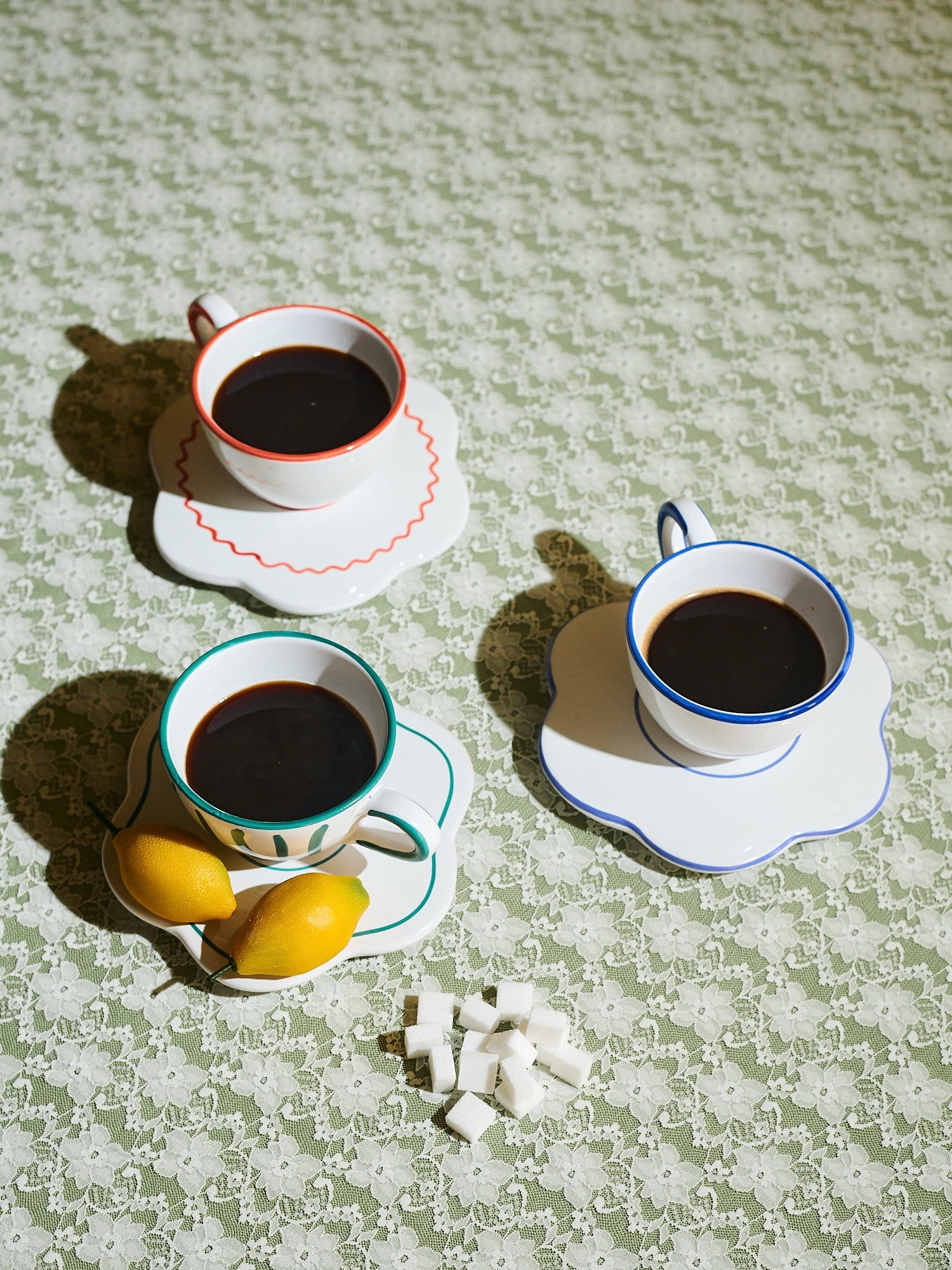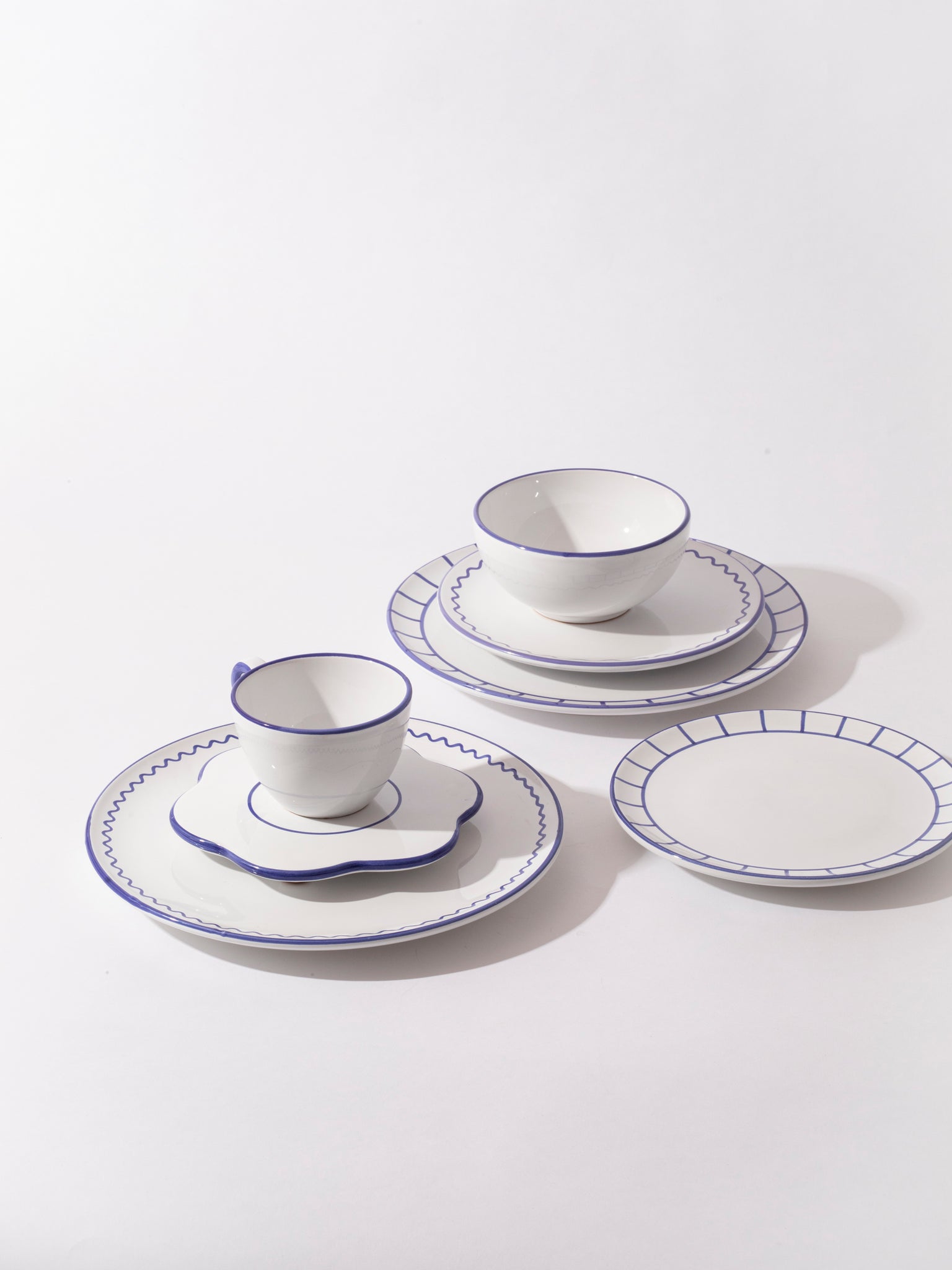 The bistro ceramic collection is inspired by traditional bistro porcelaine, but with a twist. The colours is inspired by the classic french bistro with a lobster red and basil green, and a more classic blue that match with everything in your kitchen cabin. The collection of italian hand-painted ceramics consist of saucers, bowls, bottles, lunch plates and dinner plates. When mixing and matching prints and colors it makes an infinite different combinations for the everyday tablescape.