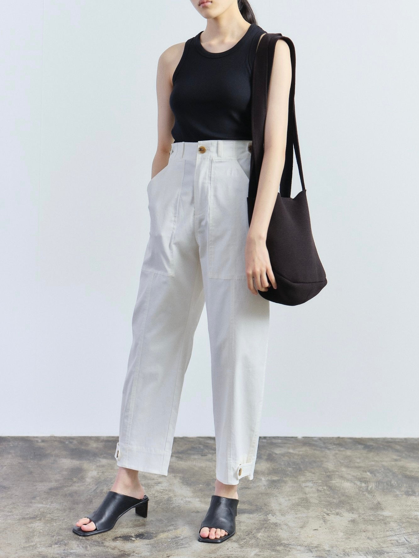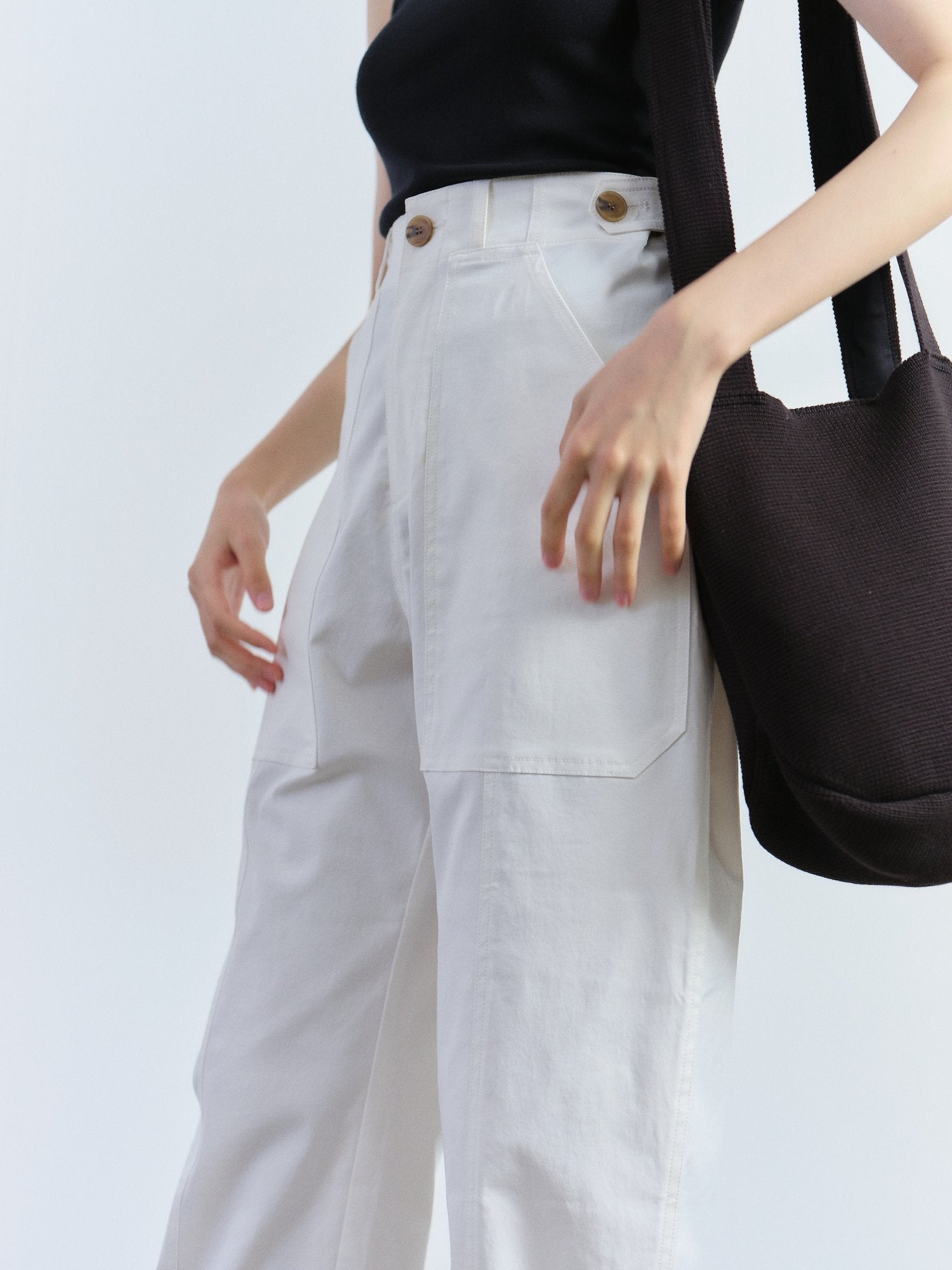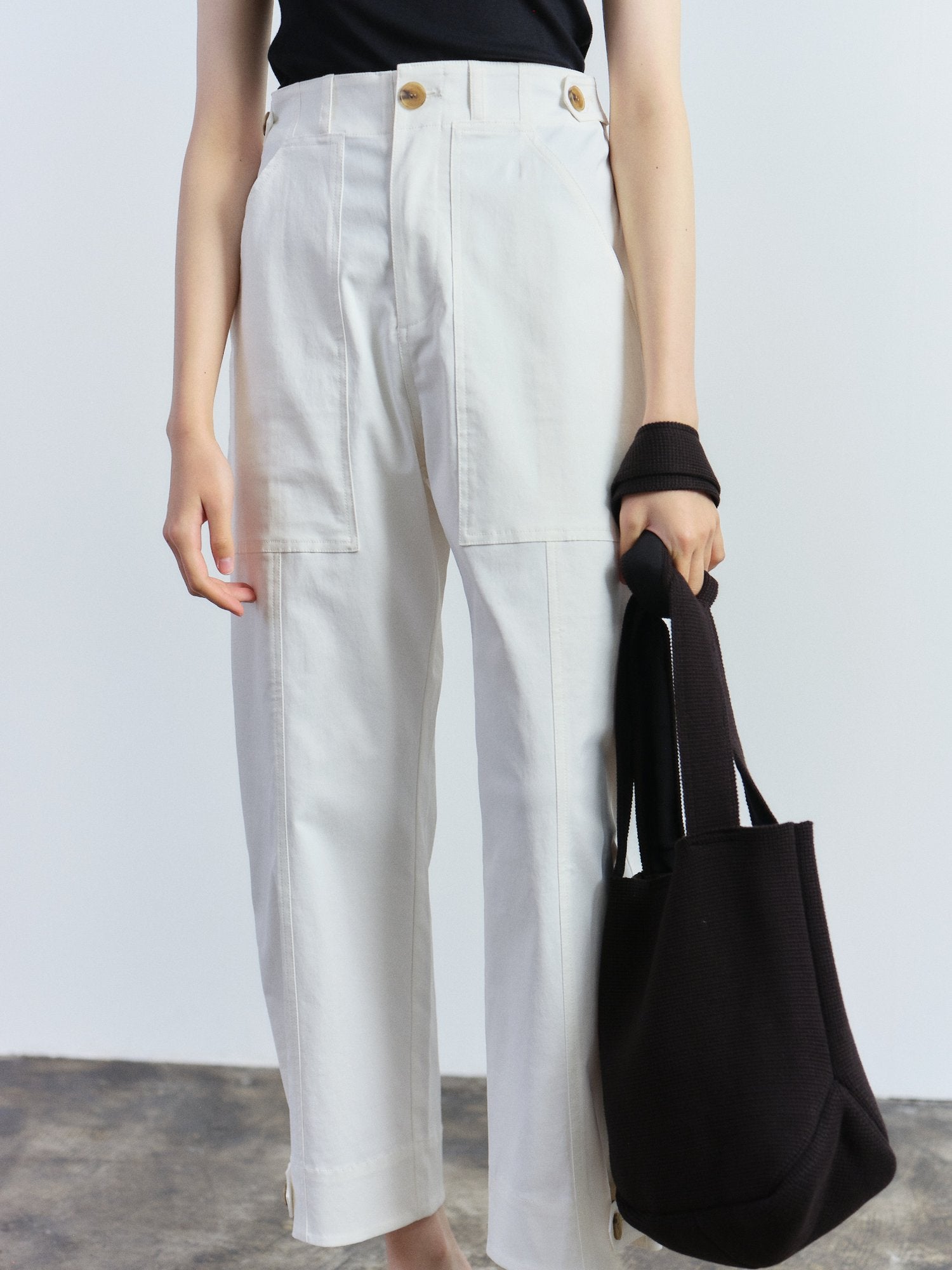 A chic cargo pants in white by Mijeong Park features a button and fly zipper closure with patch pockets two front and one back. The pants is made for comfort to be worn everyday with its stretchy fabric, adjustable waist and bottom with button and tab.