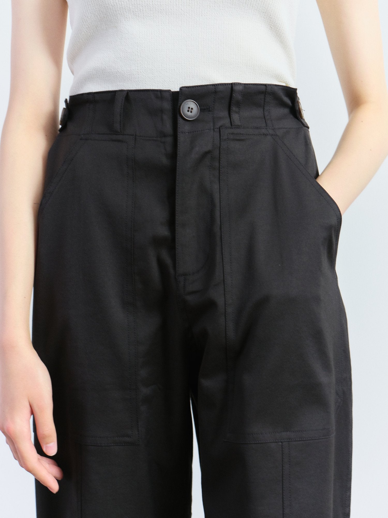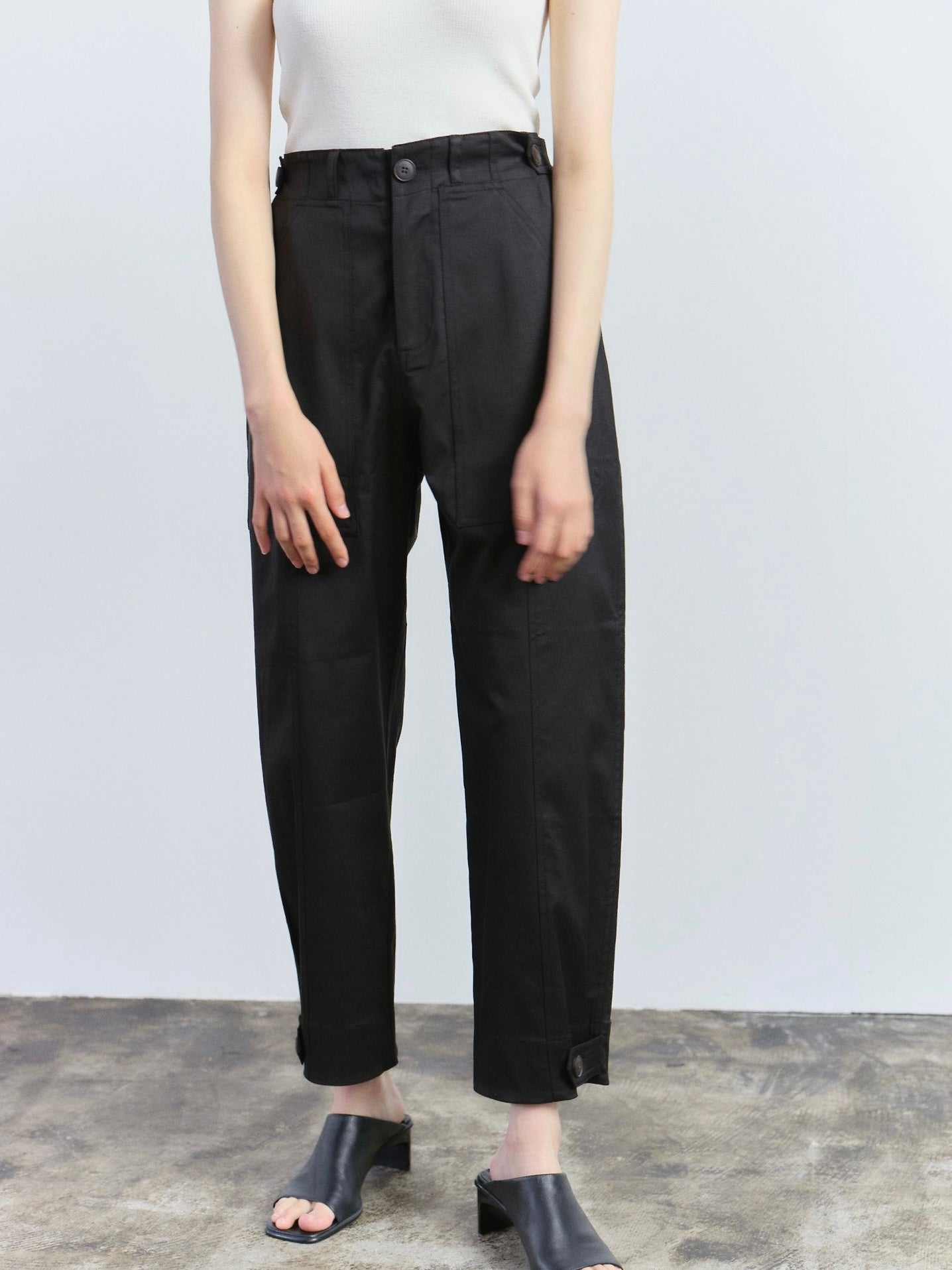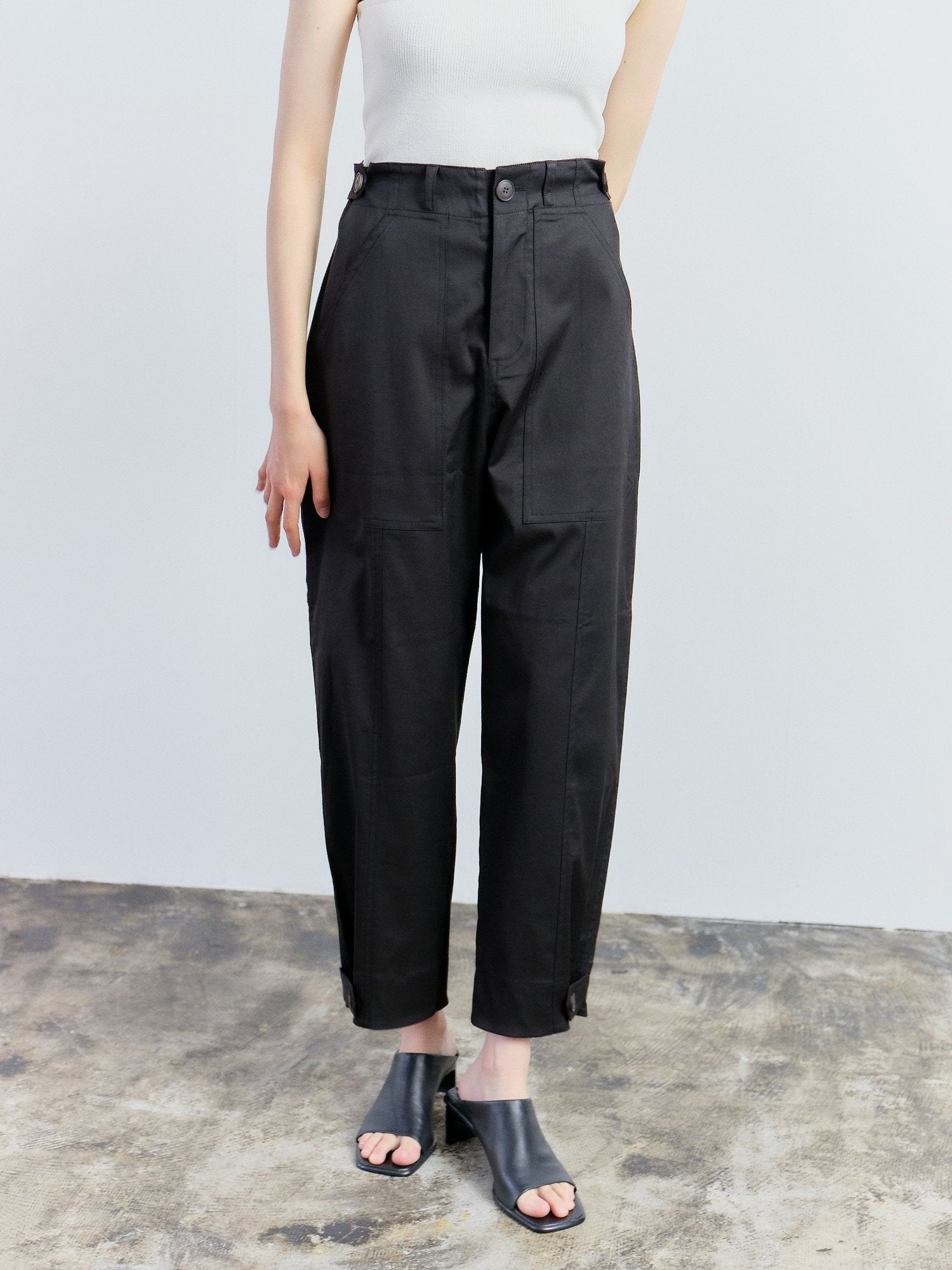 A chic cargo pants in black by Mijeong Park features a button and fly zipper closure with patch pockets two front and one back. The pants is made for comfort to be worn everyday with its stretchy fabric, adjustable waist and bottom with button and tab.