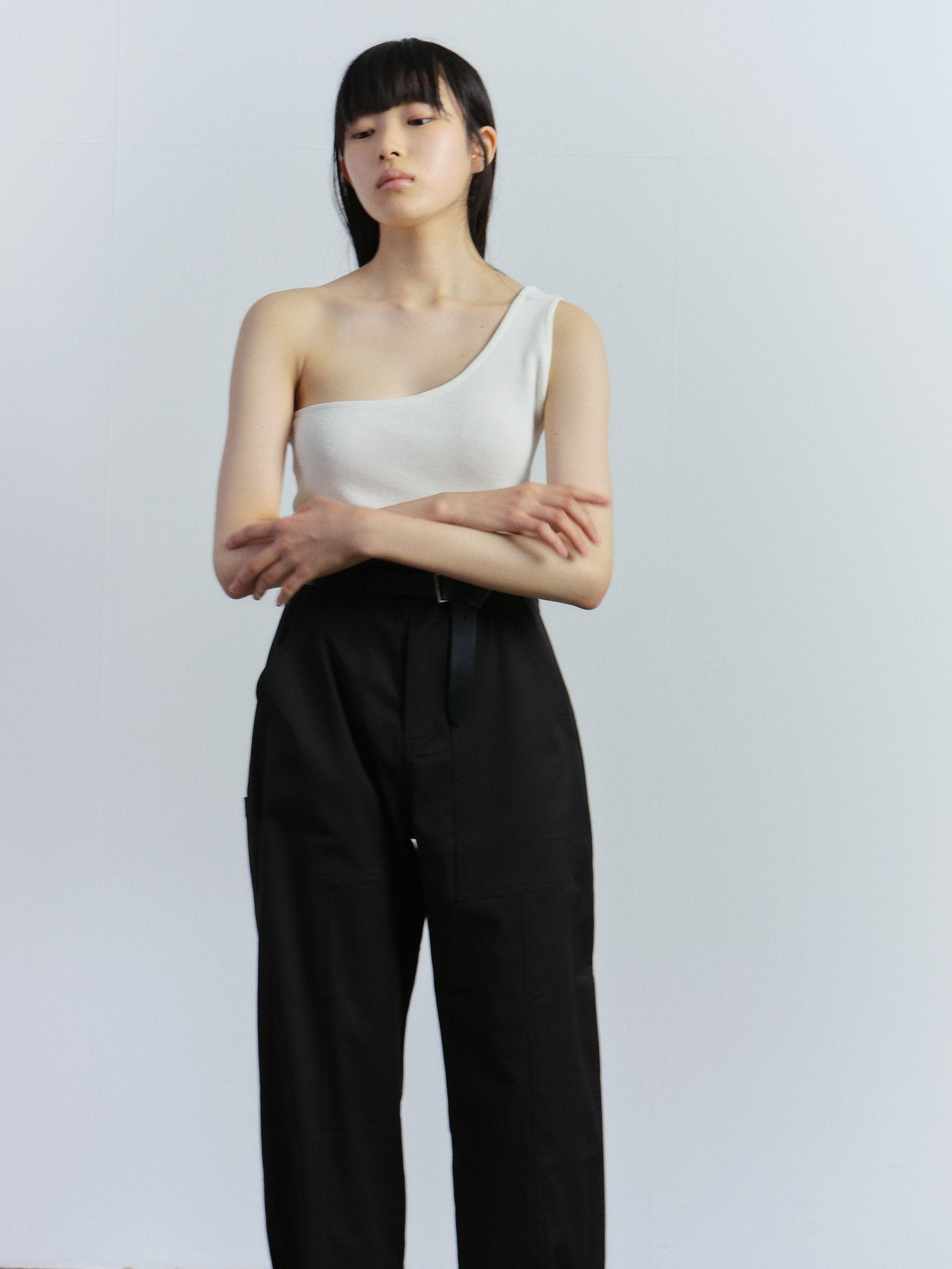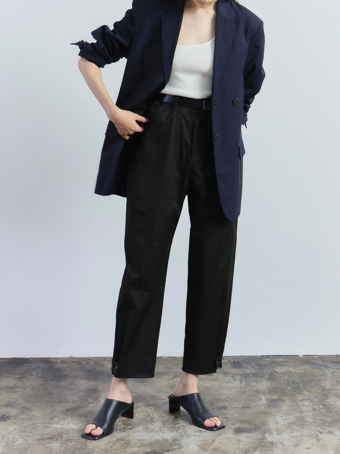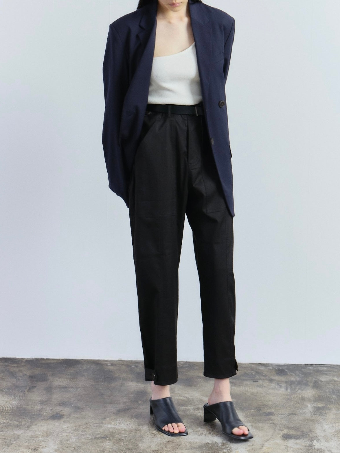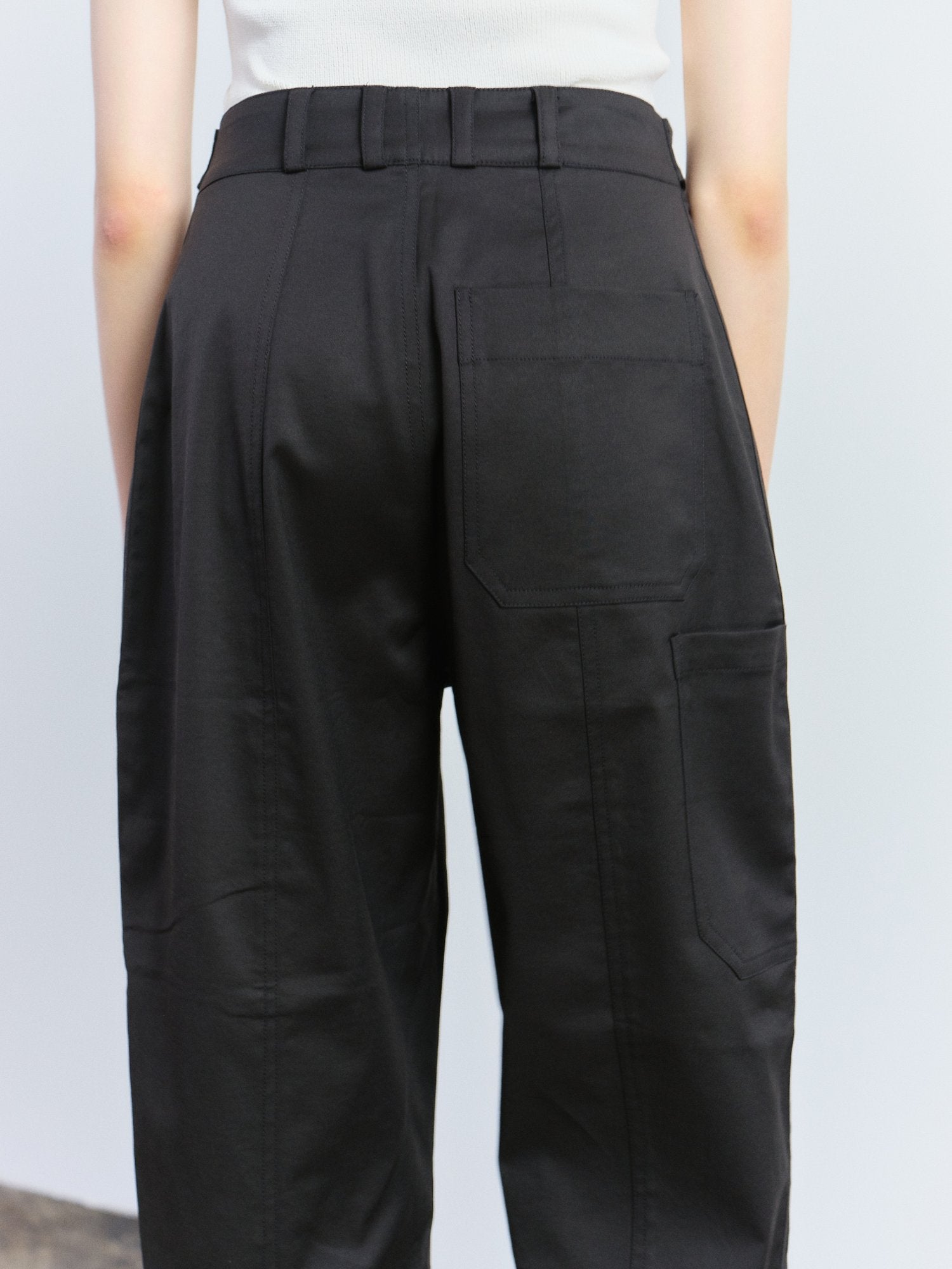 A chic cargo pants in black by Mijeong Park features a button and fly zipper closure with patch pockets two front and one back. The pants is made for comfort to be worn everyday with its stretchy fabric, adjustable waist and bottom with button and tab.