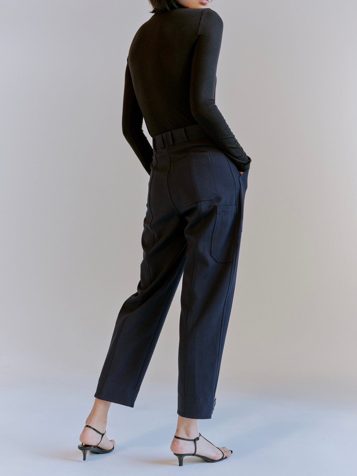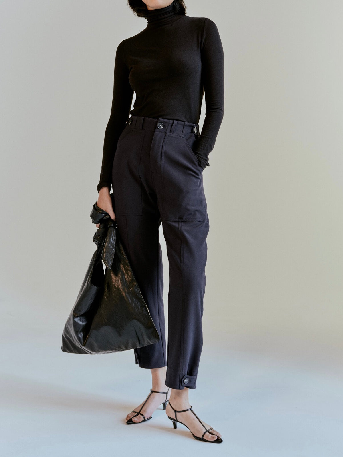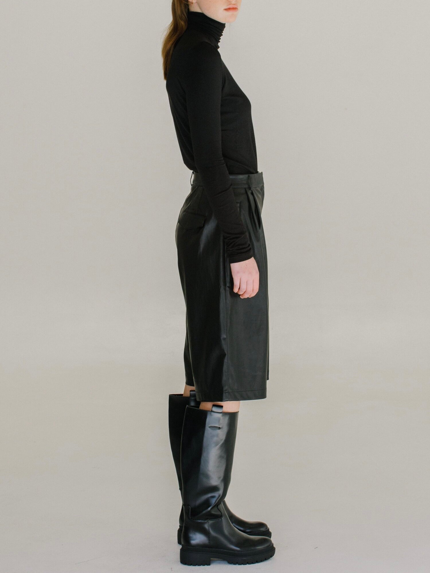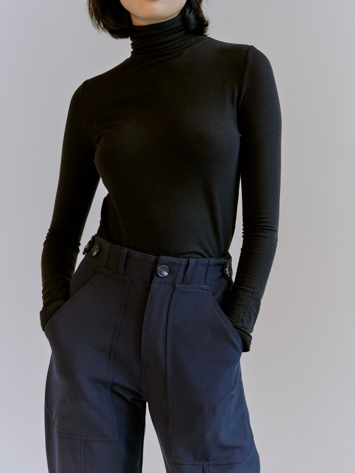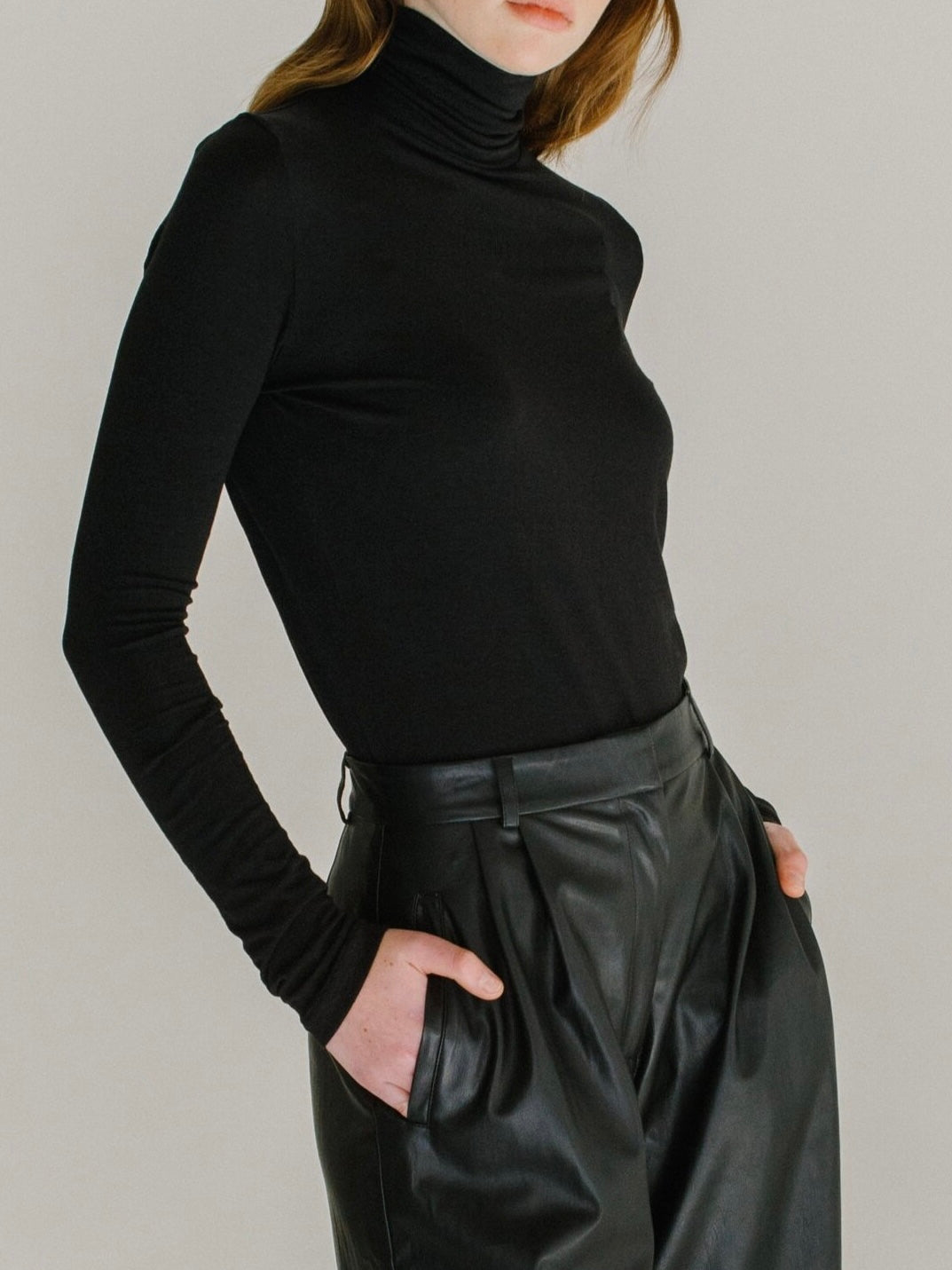The Mijeong Park Roll Neck Jersey Top in Black is a lightweight turtleneck jersey top made from *TENCEL branded lyocell and modal fibers. The fabrics have a smooth, silky feel and a cotton-like appearance. Fitted and long enough to wear tucked in. Great layering pieces.