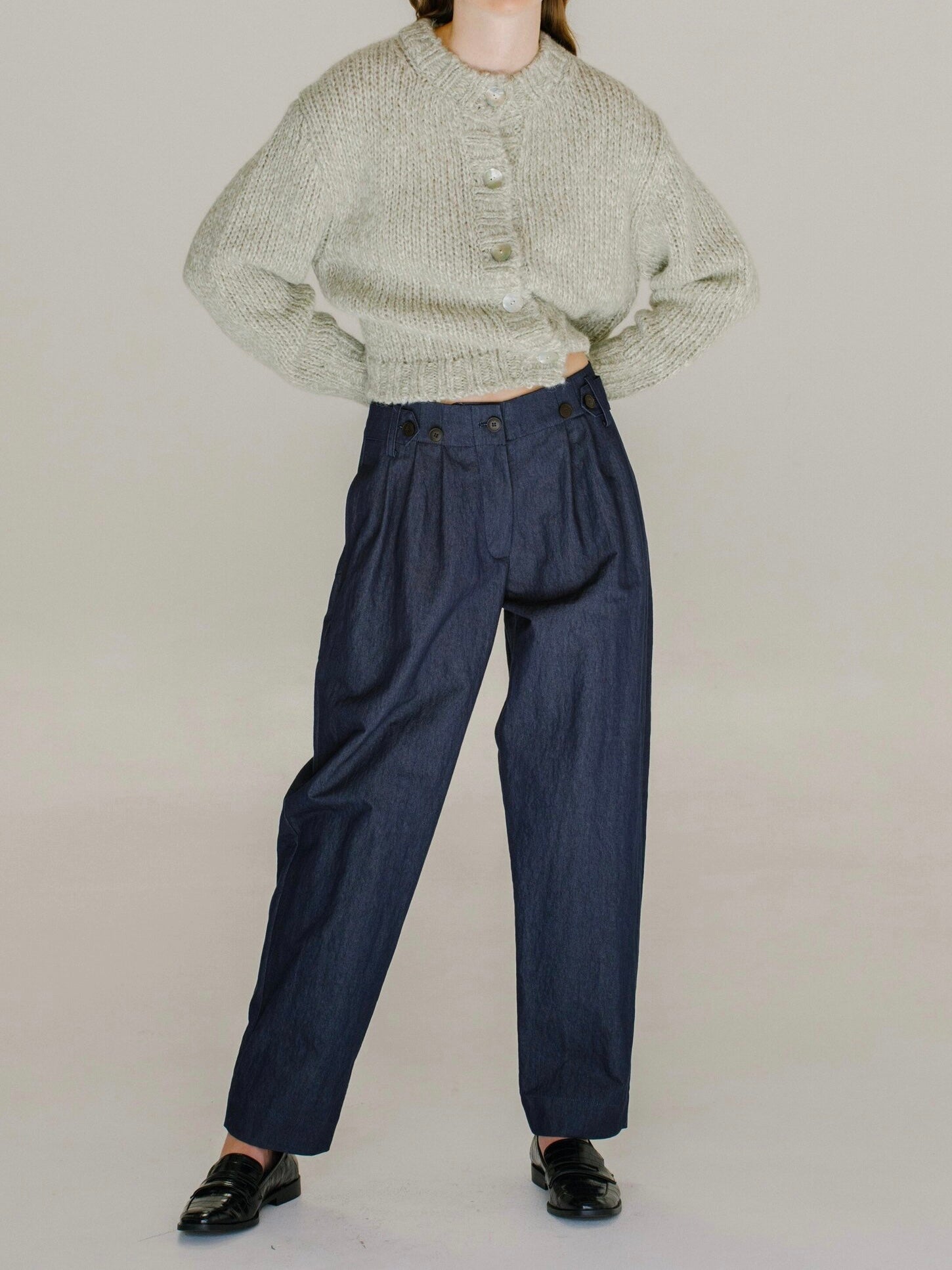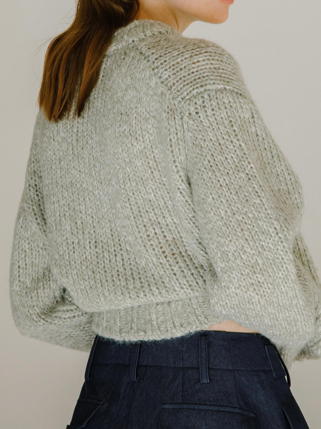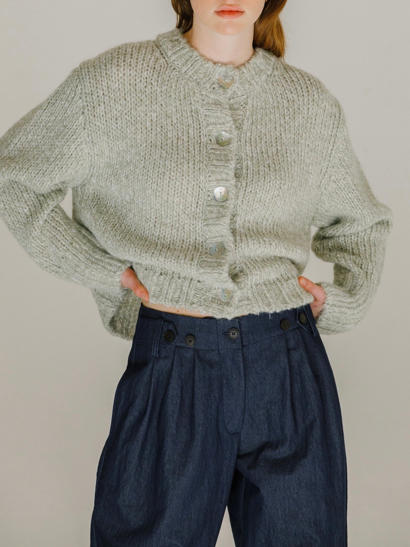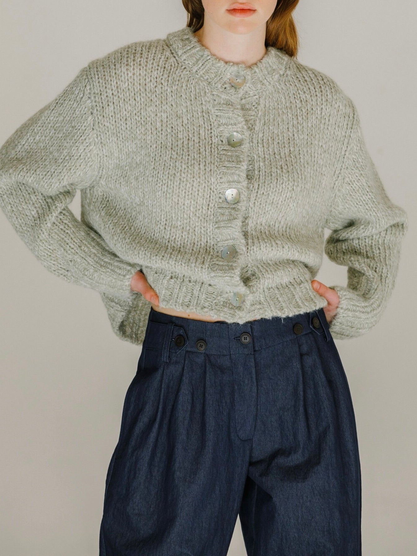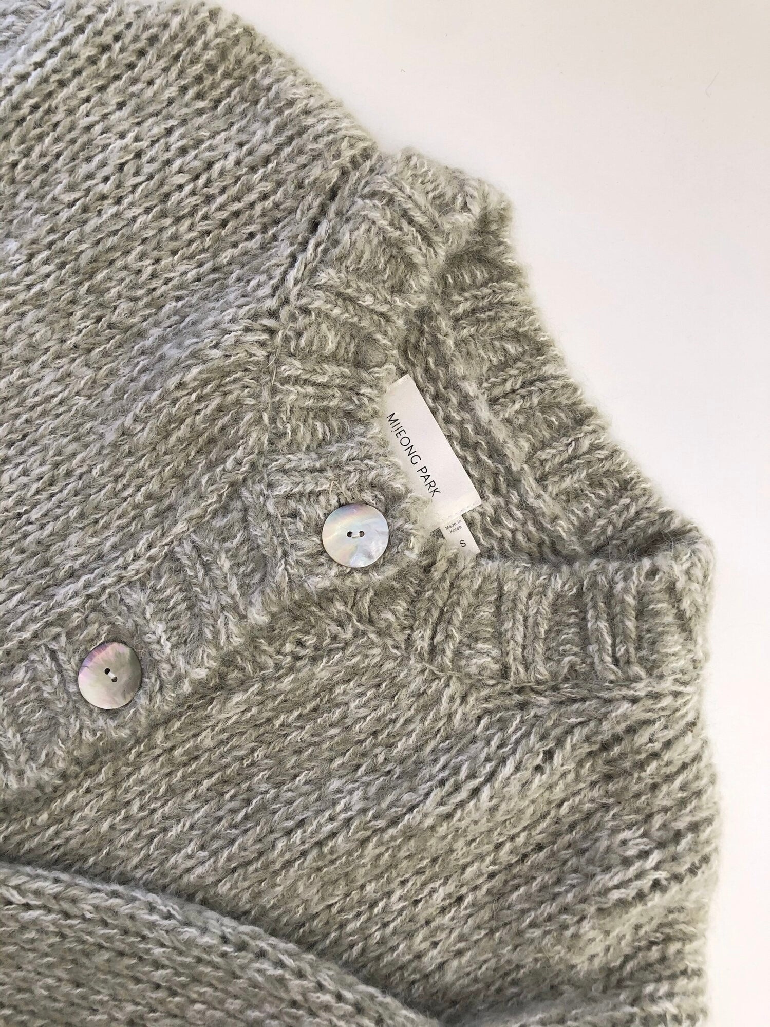 The Mijeong Park Melange Knit Cardigan in a soft textured wool blend knit. Featured a round neckline, large shell button closures. Relaxed fit with dropped shoudlers.