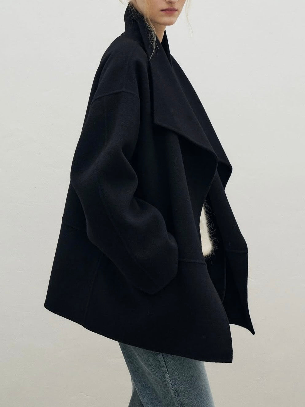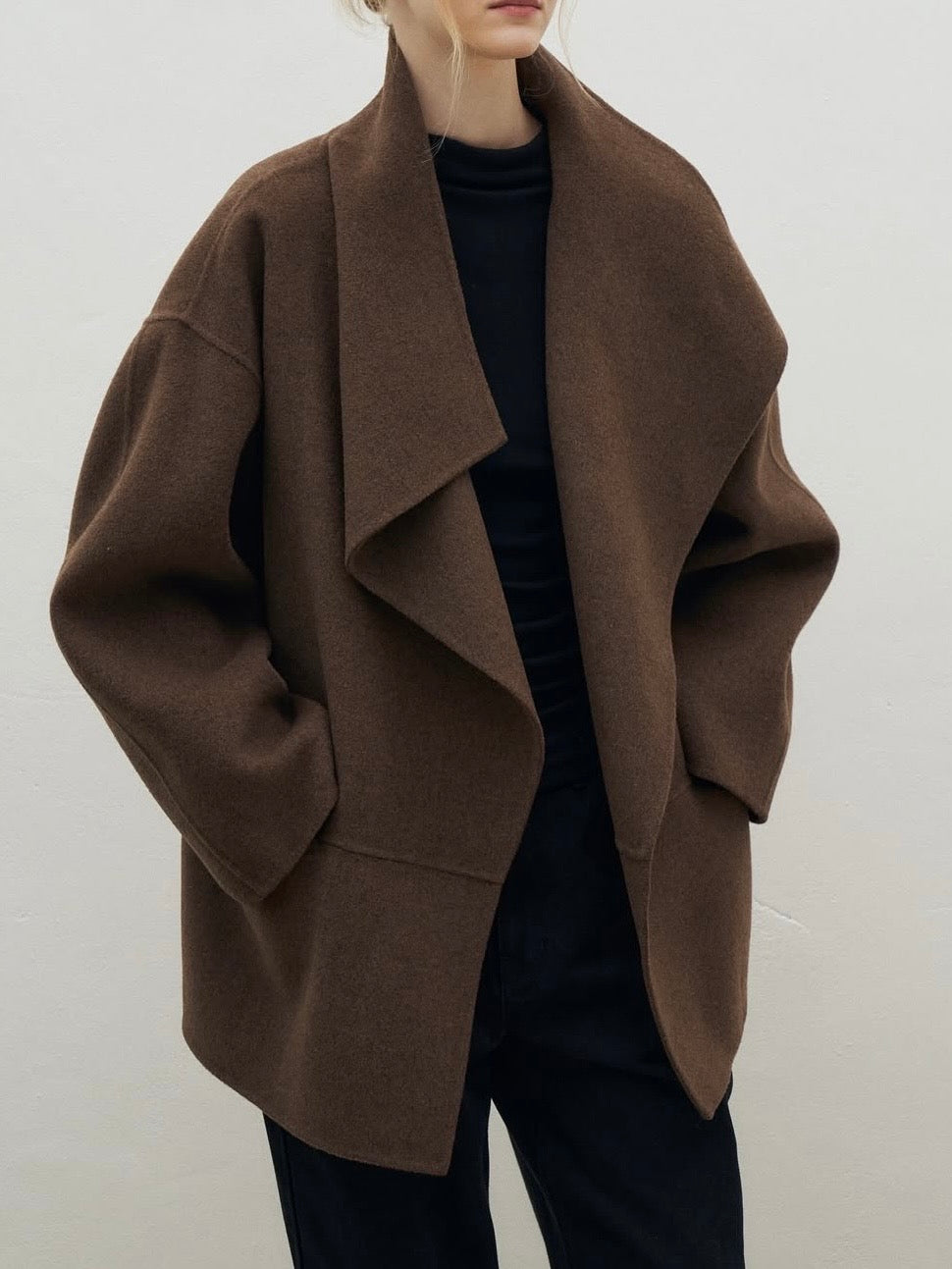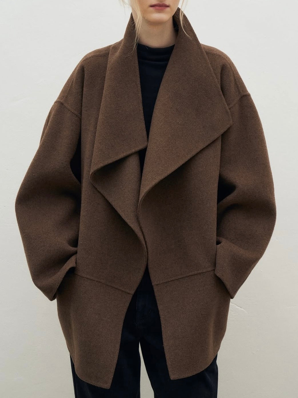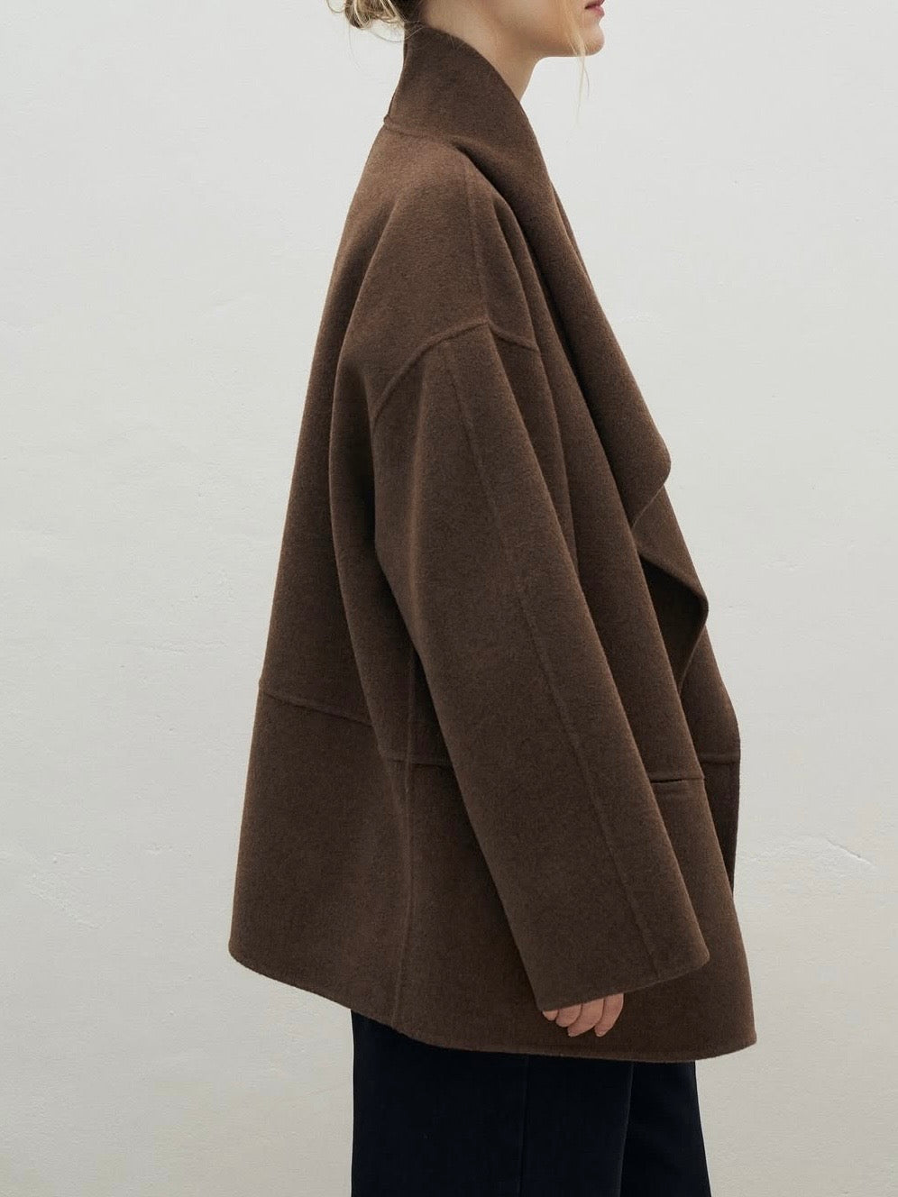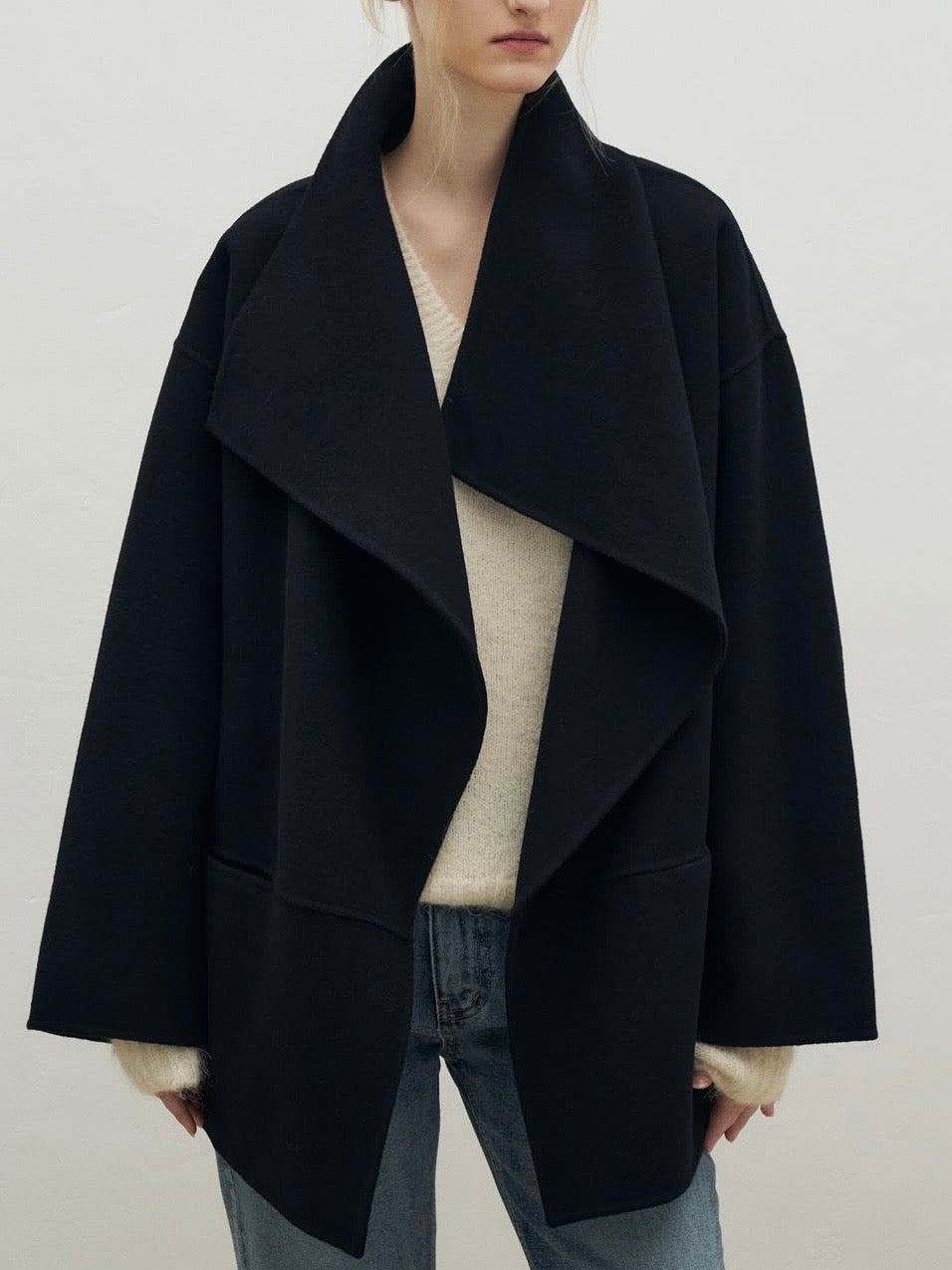• Coat featuring fluid shawl lapels and an open-front design for effortless layering