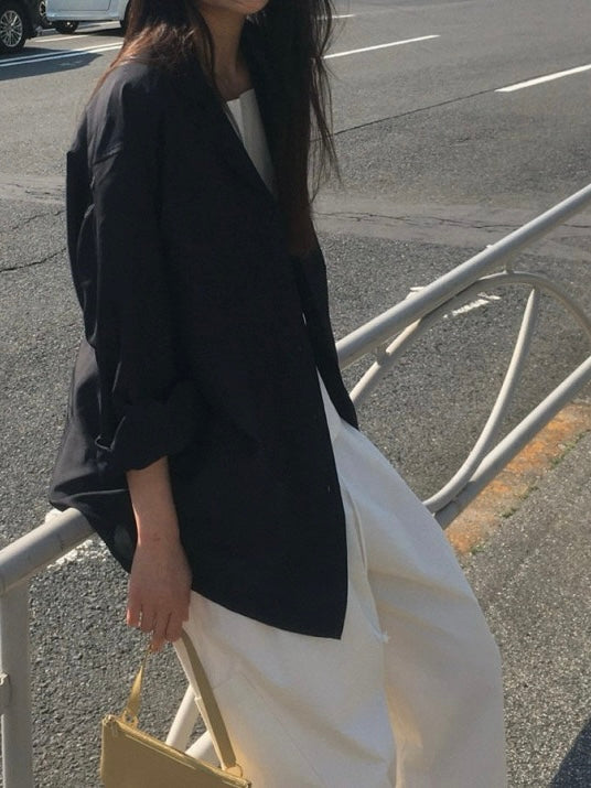 - Notched collar and front button closure