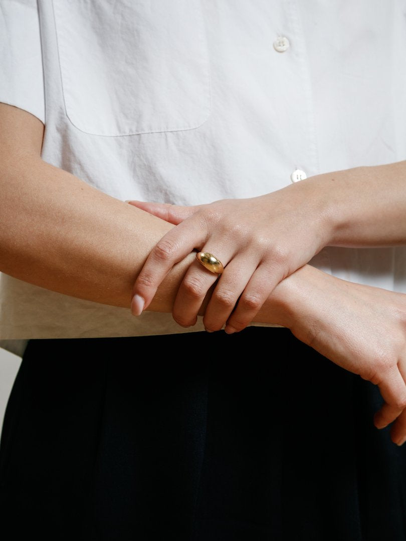The Magnes Ring in Gold handcrafted by Wolf Circus is a 14k gold plated ring. A simple but bold thick banded ring. Wear alone as a simple statement piece or pair with others.